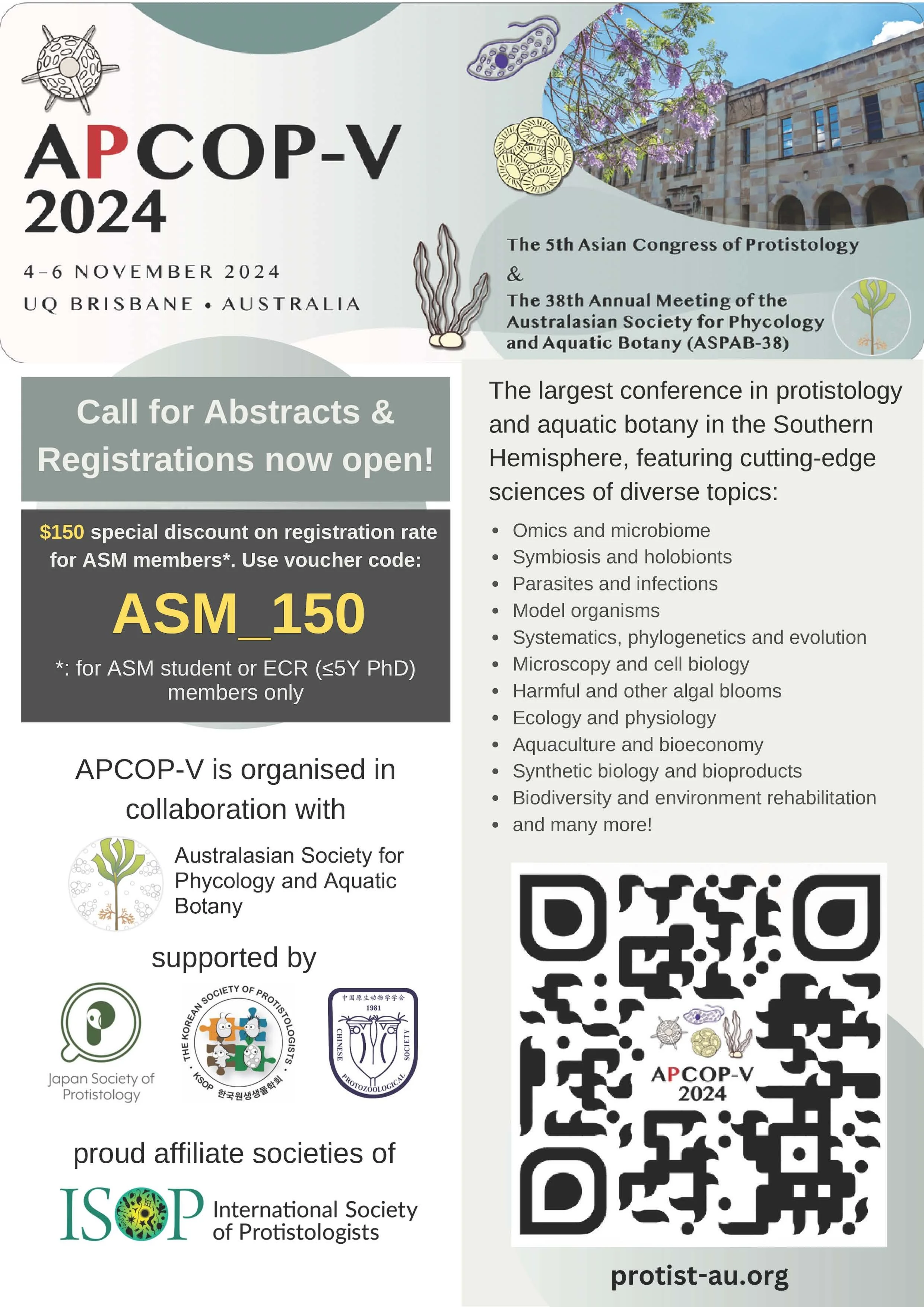 The Asian Pacific Congress of Protistology (APCOP-V) 2024 is the new branding for the 5th edition of the Asian Congress of Protistology, to be held for the first time in the Southern Hemisphere, jointly with the Annual Meeting of the Australasian Society for Phycology and Aquatic Botany (ASPAB). APCOP-V will gather students, academics, researchers, and professionals from the Asian Pacific region (and beyond) to showcase the latest research on protists, microalgae, and aquatic plants applying cutting-edge technologies, brainstorm ideas, and forge new connections. Call for abstracts is now open, so submit your best work to APCOP-V and see you in Brisbane!