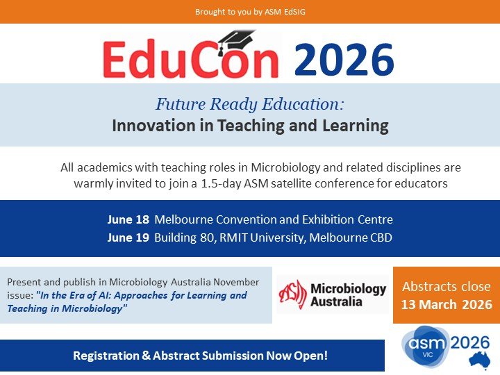 EduCon 2026 is an annual educators' meet under the auspices of the Australian Society of Microbiology (ASM). We warmly welcome you to Melbourne for the 13th EduCon event.